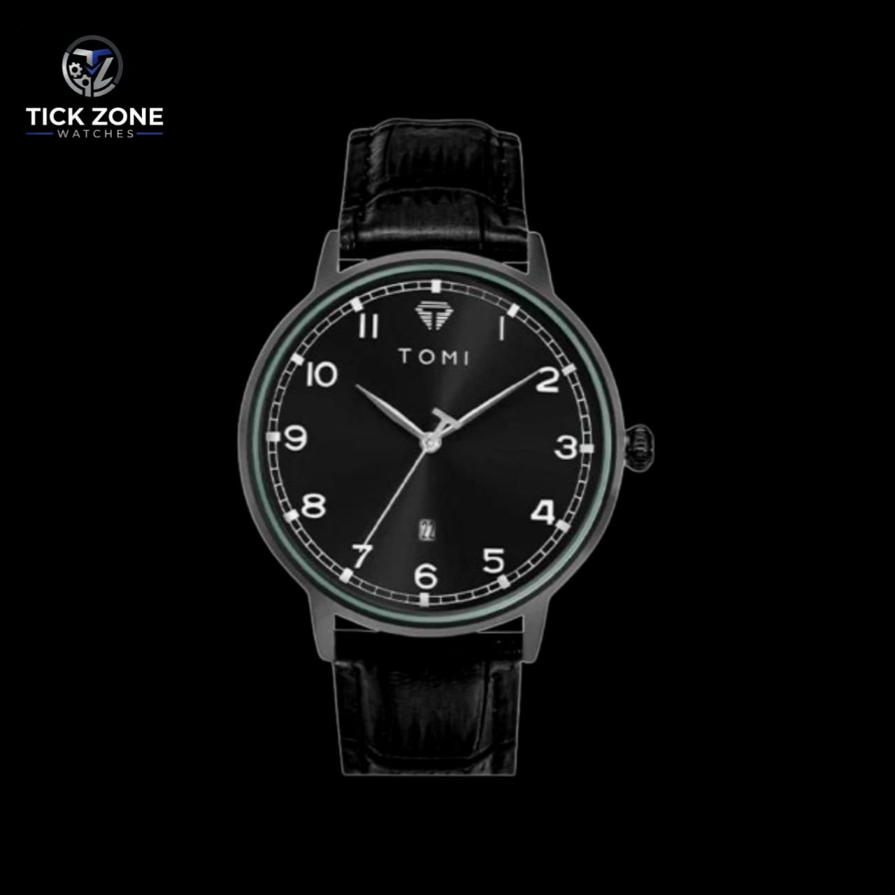 This is a sleek and modern fashion watch by TOMI, designed with a focus on high-contrast visibility and a minimalist aesthetic.