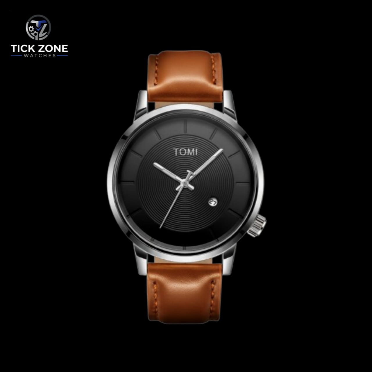 Strap: The watch is paired with a Genuine Brown Leather strap, often featuring an embossed "TOMI" logo for an authentic look.