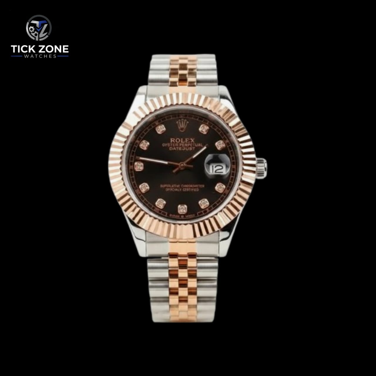 Dial: It features a deep chocolate brown sunray dial set with 10 factory diamonds that serve as luxurious hour markers.